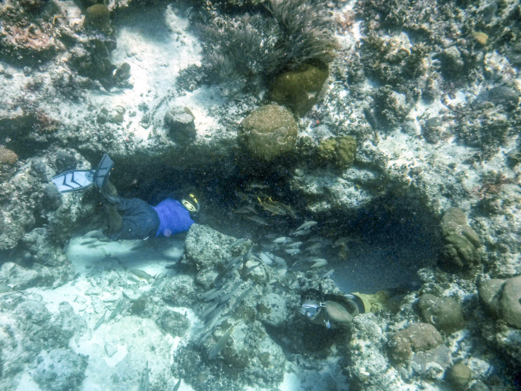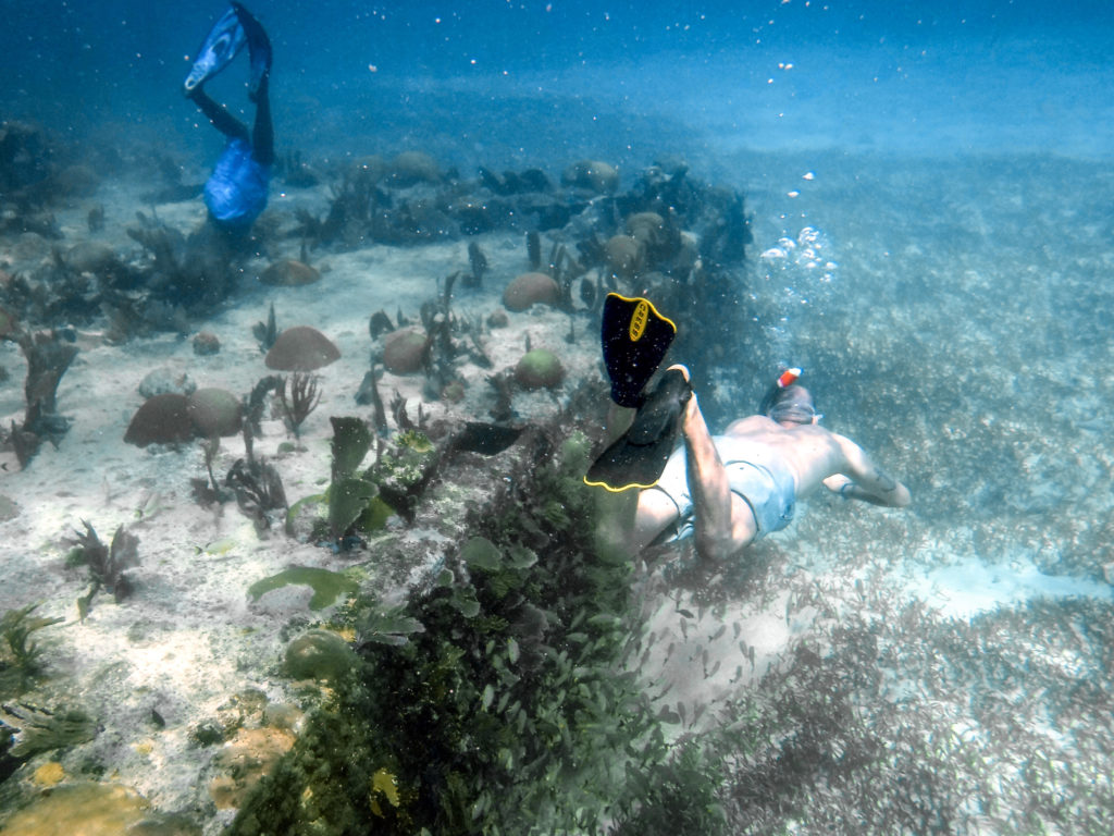 Es folgt der erste richtige Schnorchelstopp an einem Schiffswrack, welches teilweise schön mit Corallen bewachsen ist. Hier tummeln sich einige Fische und vereinzelt auch Rochen. Dann geht es weiter zu Plätzen wo sich Seekühe (Manatees) und Schildkröten aufhalten. Wir hatten leider Pech, an dem Tag unserer Tour haben wir keine gefunden. Die Seekühe hätten wir wirklich gerne gesehen, die Chancen stehen sehr gut zwischen Juni und September, wir waren leider im November dort. Dass wir keine Schildkröten gesehen haben, war für uns kein Problem, denn wir haben schon oft welche gesehen.