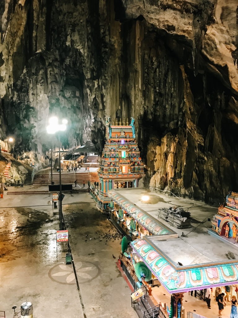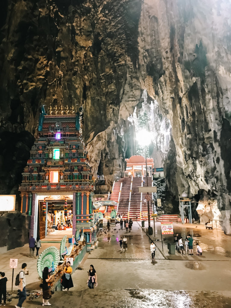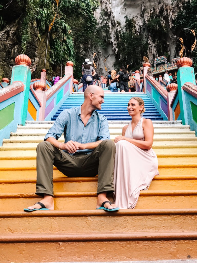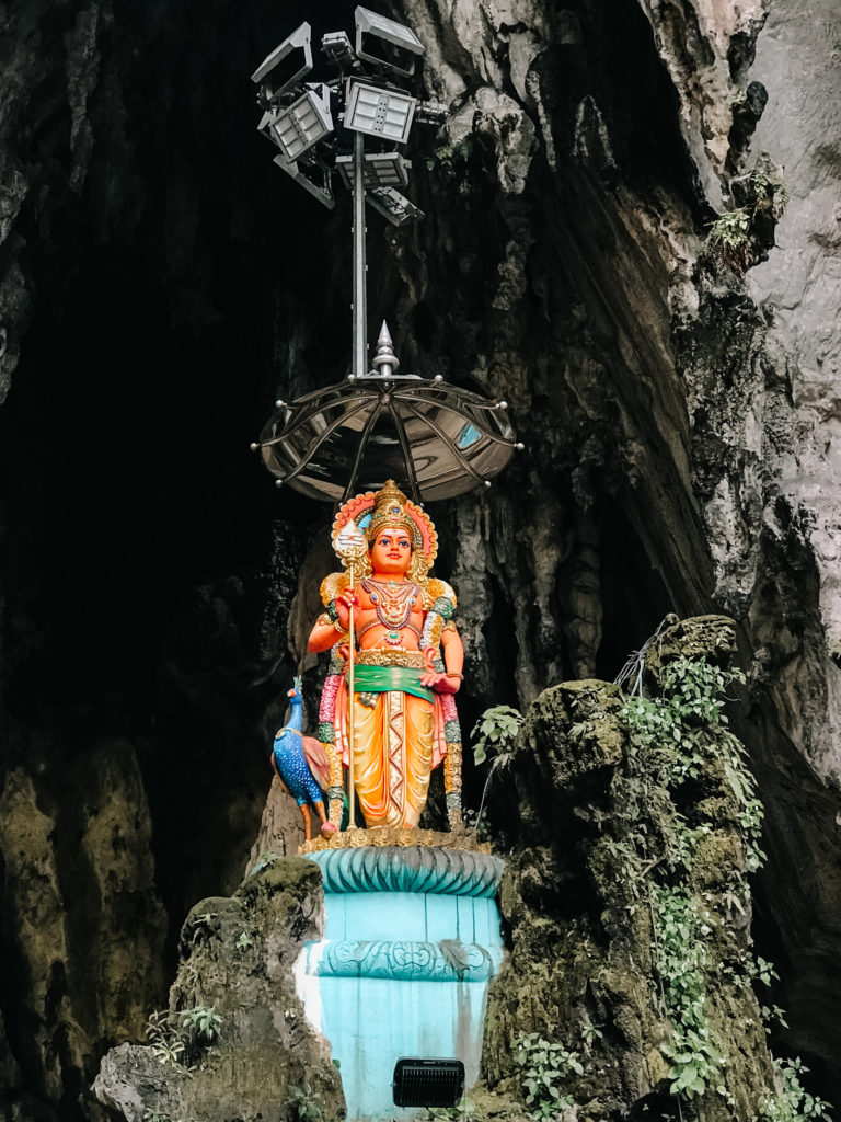 Auf dem Vorplatz ragt die riesige goldene Statue des Gottes Murugan in die Höhe und direkt dahinter gelangst du über die 272 bunten Treppenstufen hinauf zum eigentlichen Höhlentempel. Meist wird man gebeten, die linke Treppe für den Aufstieg und die ganz rechte für den Abstieg zu nehmen, da die mittleren Treppen für die gläubigen Hindus reserviert sind. Ganz früh morgens, um ein paar Fotos zu machen, konnten wir jedoch auch in die Mitte.