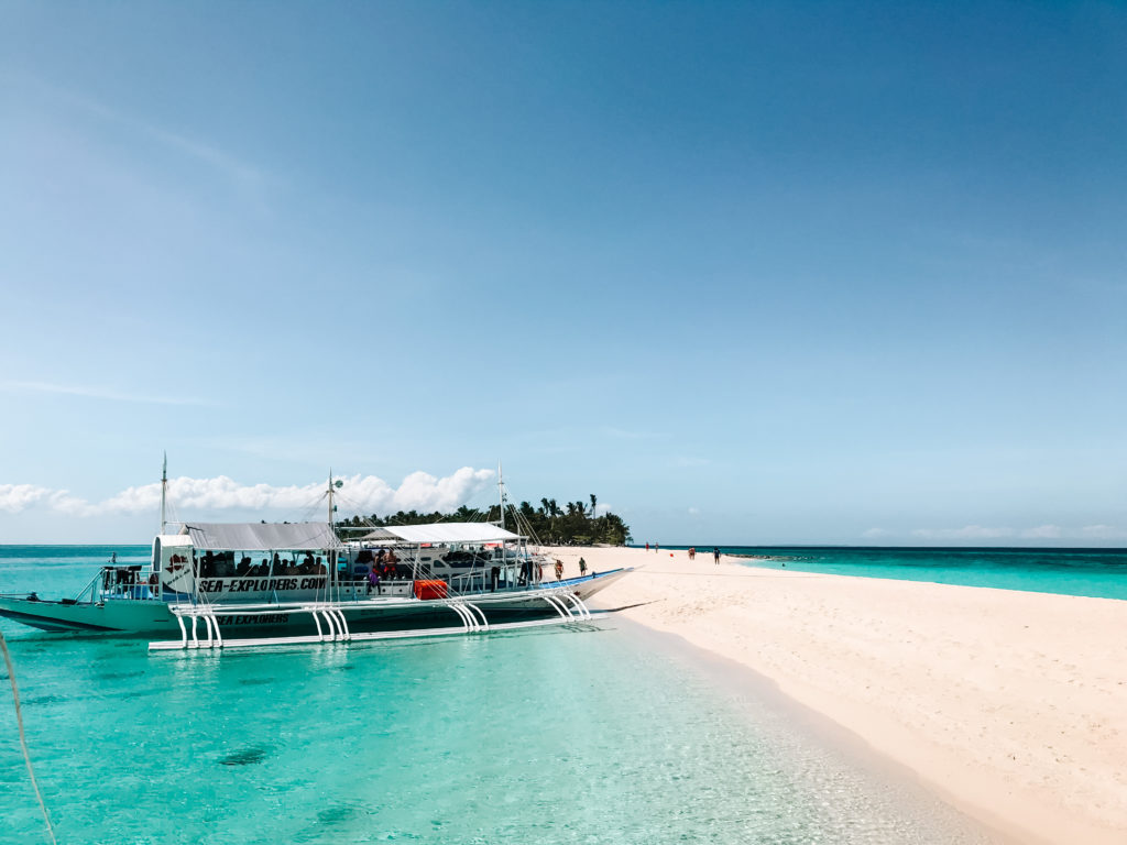 Die Boote kommen in Malapascua am Bounty Beach an. Wenn Ebbe ist, wird man mit einem kleinen extra Boot (20 Pesos) an den Strand gebracht.