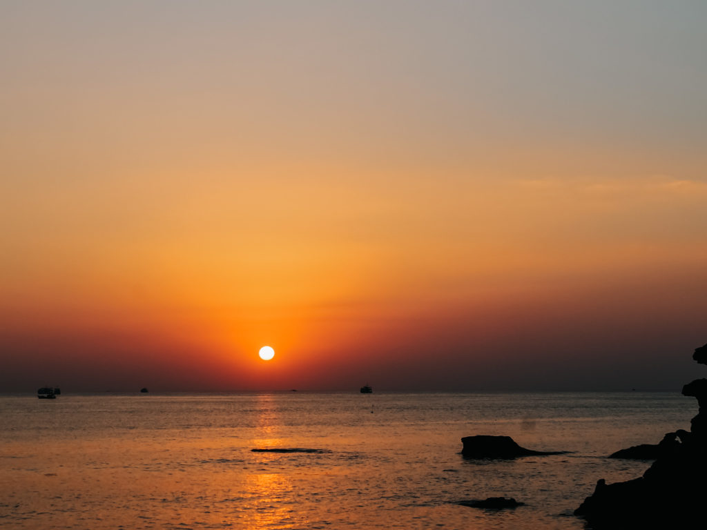 Die Sonnenuntergänge auf Phu Quoc sind wunderschön. Von der Westküste aus kannst du perfekt am Strand chillen, die Füße im Sand, in der Hand ein kühles Bier und die Sonne bewundern, wie sie hinter dem Meer untergeht. Meist ist der Himmel wolkenlos und du kannst die glühend rote Kugel am Horizont verschwinden sehen. Tolle Plätze für den Sonnenuntergang sind der Long Beach, z.b. in einer Strandbar oder auch der Duong Dong Beach und die Aussichtsplattform des Dinh Cau Tempels neben dem Strand.